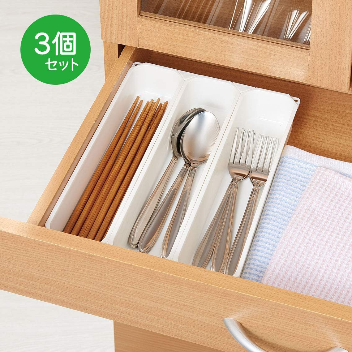 每組內含三個收納盤,最特別之處在於其靈活的連結設計,隨盒附送 4 個專用連接扣,您可以根據抽屜的寬度或深度,自由選擇橫向或縱向拼接,完美填補抽屜空間。純白色的簡約外觀配合耐用的聚丙烯材質,不僅質感大方,更可直接拆下用水清洗,確保餐具存放環境衛生。除了擺放筷子、湯匙及刀叉等餐具外,也非常適合放在書檯抽屜內整理原子筆、尺子等文具,或是擺放化妝刷具,是實現日式收納美學、告別凌亂抽屜的必備配件👍🏻