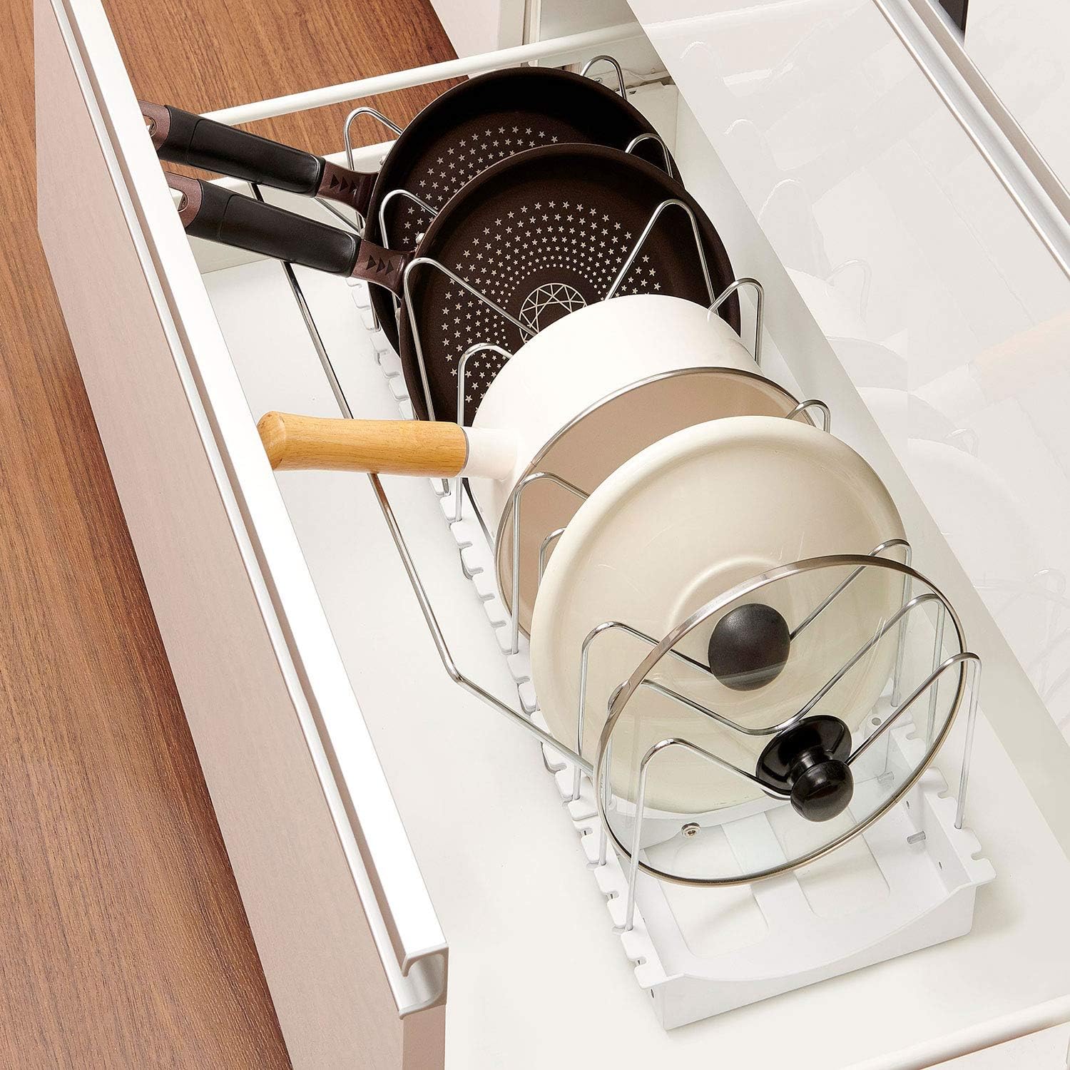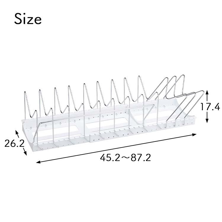 能有效整理煩擾的鍋具、煎鍋及鍋蓋,避免堆疊凌亂。產品採用可伸縮設計,寬度可由45.2cm至87.2cm自由調整,適合不同櫥櫃或流理台下空間使用。配備M型分隔架,可同時收納多達12件鍋具或蓋子,並設有手柄保護設計,取放更安全方便。白色簡約外觀,容易融入各種家居風格,讓廚房保持整潔有序👍🏻