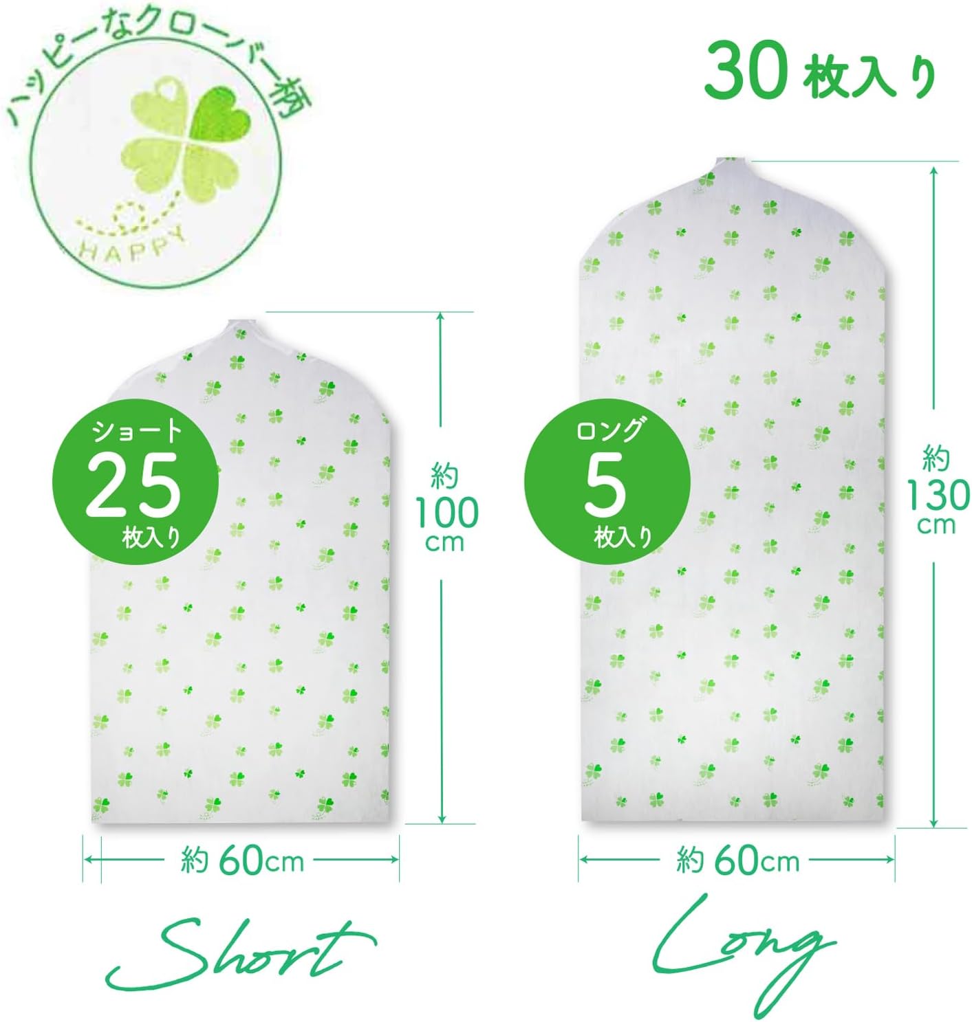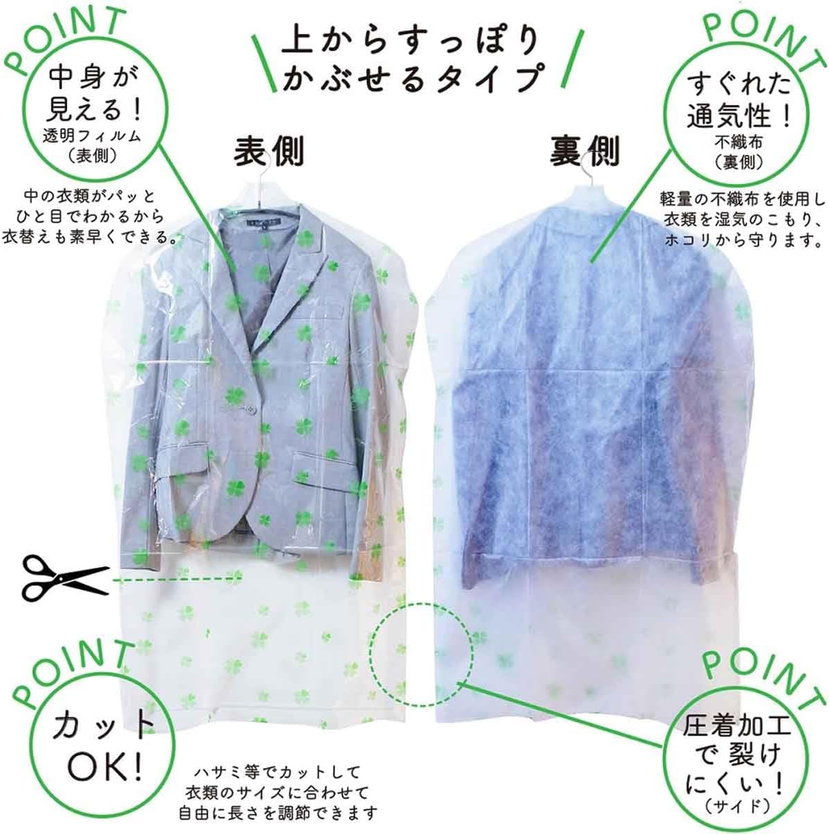 一套設計方便的衣物防麈套,每套30個(短x25 + 長x5),不同尺寸分兩面取出,特別適合用作換季時需要大量衣物套時使用。採用特殊加工,有效防止蟲害及霉菌滋生,保持衣物衛生。不織布材質,透氣性良好,避免衣物受潮。前方為透明,方便辨認衣物。日本和歌山縣製造,四葉草圖案清新整潔👍🏻