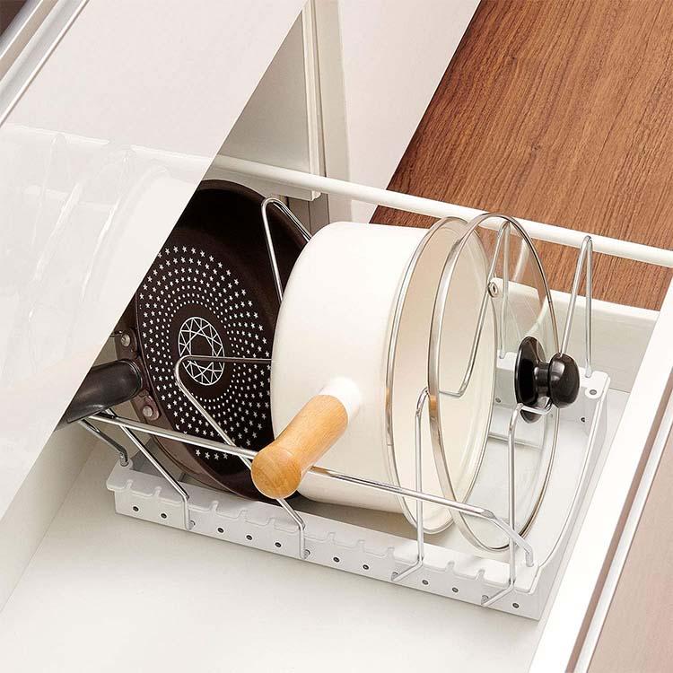 能同時整理煎鍋、湯鍋及鍋蓋,避免堆疊凌亂。產品採用伸縮結構,寬度可由29cm至55cm自由調整,適合不同櫥櫃或流理台下空間。分隔架設計能穩固放置多件鍋具,取放方便,保持廚房整潔。白色簡約外觀,容易融入各種家居風格,讓廚房更有秩序👍🏻