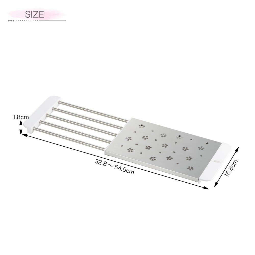 具備可調節長度的滑軌結構,能根據不同水槽寬度靈活伸縮,最大可延伸至54.5cm,適合香港家庭常見的中小型廚房空間。托盤表面飾有細緻櫻花圖案,增添日式雅緻氛圍,既實用又具觀賞性。產品可作為水切架使用,適合晾乾杯具、碗碟、鍋具等,亦可作為臨時備料平台,提升料理效率。底部附有防滑膠墊,穩固不易滑動,使用時更安心。整體結構採用高品質不鏽鋼與ABS樹脂製成,堅固耐用,抗鏽耐濕,易於清潔,適合長期使用👍🏻