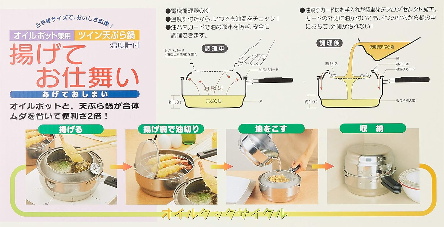 🔥🔥【日本製《小田島》不鏽鋼天婦羅鍋】附油濾網及溫度計 🇯🇵🇯🇵日本製造🇯🇵🇯🇵 鍋具與油濾網、油切架及油飛濺防護板一體化設計,能同時完成炸物、瀝油、過濾及油保存的流程,大幅減少料理後的清理工作。鍋身採用 18-0 不鏽鋼,耐用且導熱均勻,底部厚度達 0.8 mm,適合穩定加熱;配備溫度計,能精準掌握油溫,確保炸物口感酥脆。油飛濺防護板經氟素樹脂塗層加工,能有效減少油花外濺,保持廚房整潔。此鍋支援明火及 100V IH 電磁爐,兼顧傳統與現代廚房需求,結構設計緊湊👍🏻 尺寸:鍋本體約 340 × 207 × 高 84 mm 容量:滿水約 1.9 L,適正油量約 1.0 L 重量:約 1270 g 材質: 鍋本體:18-0 不鏽鋼(底厚 0.8 mm) 取手:樹脂 油濾網:18-8 不鏽鋼 油飛濺防護板:鐵(氟素樹脂塗層加工) 油切架:鐵(鉻鍍層) 產地:日本製造 💢如沒註明【現貨】訂貨需時約3-4星期 ___________________________________________ 💬 唔想錯過最新產品資訊及優惠歡迎加入我哋Whatsapp群組: https://chat.whatsapp.com/IJFfq1i7kMz46Zjc1NSXQF ___________________________________________