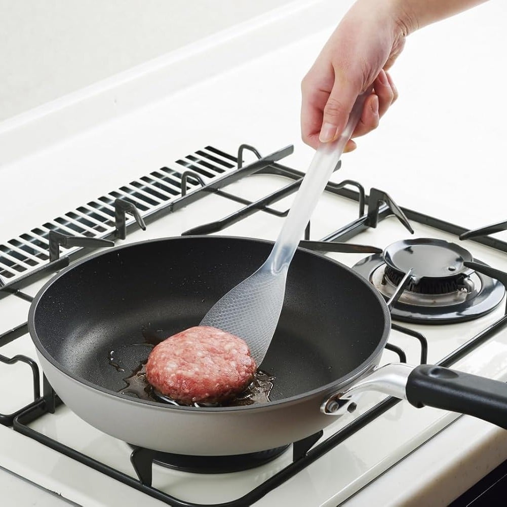 一款結合「炒、盛、翻、撈、放」多功能於一身的廚房工具,專為日常煮食設計。產品採用高耐熱的TPX®材質製成,具備優異的耐熱性(可達180°C),適用於各類鍋具,包括不黏鍋,亦不易刮傷鍋面。飯勺表面經雙重壓紋處理,有效防止飯粒黏附,無論是炒飯、拌飯或盛飯都能輕鬆完成。寬口設計配合薄身勺面,能順利伸入鍋底,完整撈起食材,特別適合大鍋炒菜或拌飯使用。手柄加長設計,操作時可遠離熱源,減少燙傷風險;勺面設計可懸空擺放,避免直接接觸檯面,更加衛生。尾端設有掛孔,方便吊掛收納,節省空間👍🏻